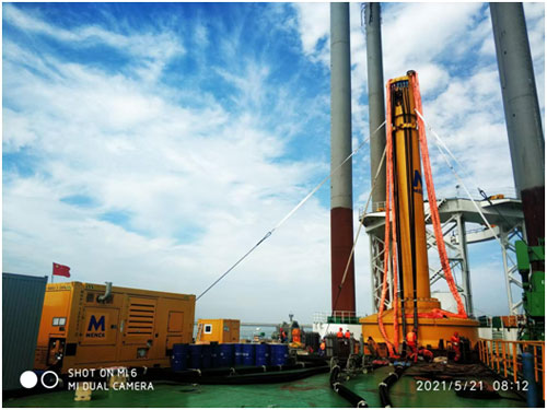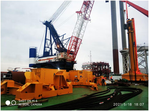 2021年5月,響應(yīng)客戶要求,上海朗信前往啟東呂四海上風(fēng)電建設(shè)現(xiàn)場,協(xié)助天津冠盛完成液壓打樁錘組裝調(diào)試和打樁測試,助力一航局海上風(fēng)電樁基礎(chǔ)施工。
